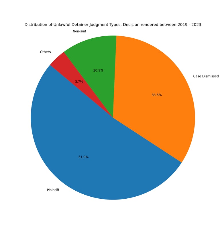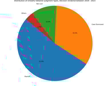 This chart shows distributions of Virginia General District Court decisions. When a plaintiff files an Unlawful Detainer lawsuit, there is a slightly better than 51% of winning the case.